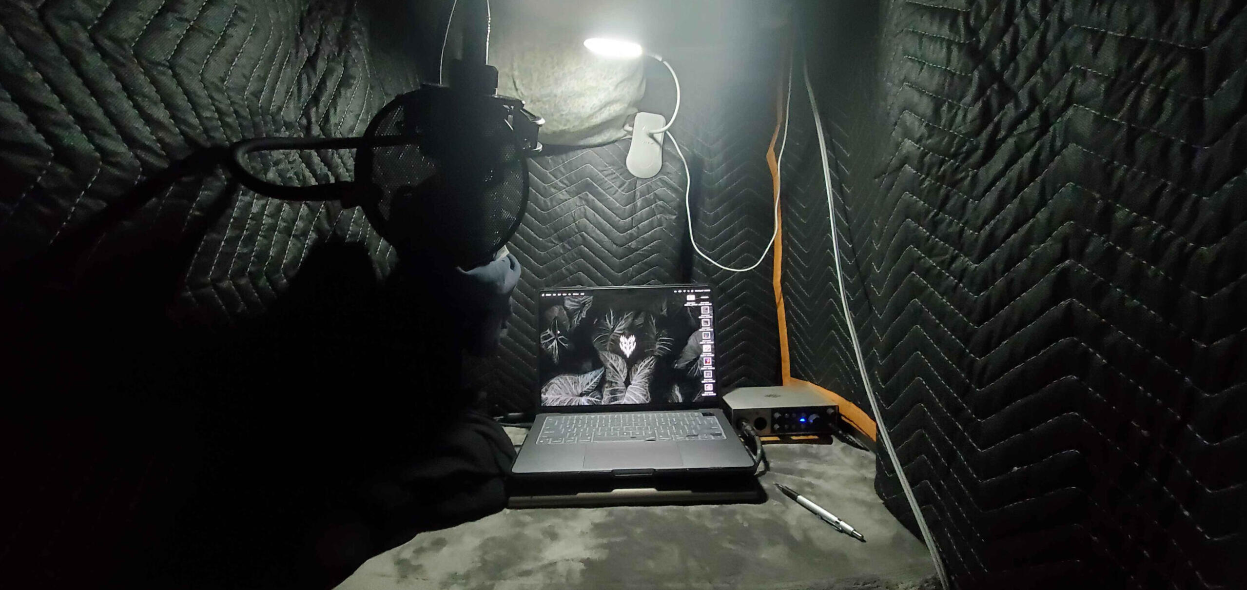 Microphone - Lewitt 440 PureInterface - Universal Audio Volt 2DAW - ReaperPlugin - iZotope RX 11 StandardMacbook Pro 2Anker - Prime TB5 Docking StationWired Ethernet CableWalk-in ClosetAcoustic Treatment-60db to -55db (Non-Traffic Hours)3 Cute Animal Plushies (Emotional Support)
